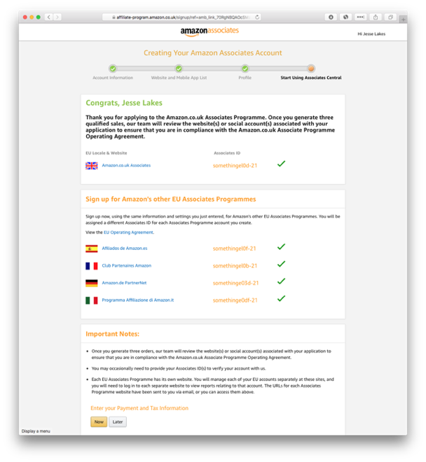 A trick when signing up with the Amazon UK program is that after you’ve finished the process, you can automatically apply the same information to four additional programs in Europe: Germany, Italy, France, and Spain. This makes the sign-up process significantly faster and when factored in with Canada and the original Amazon.com / US program gives you seven affiliate programs that often cover the bulk of your international audience.