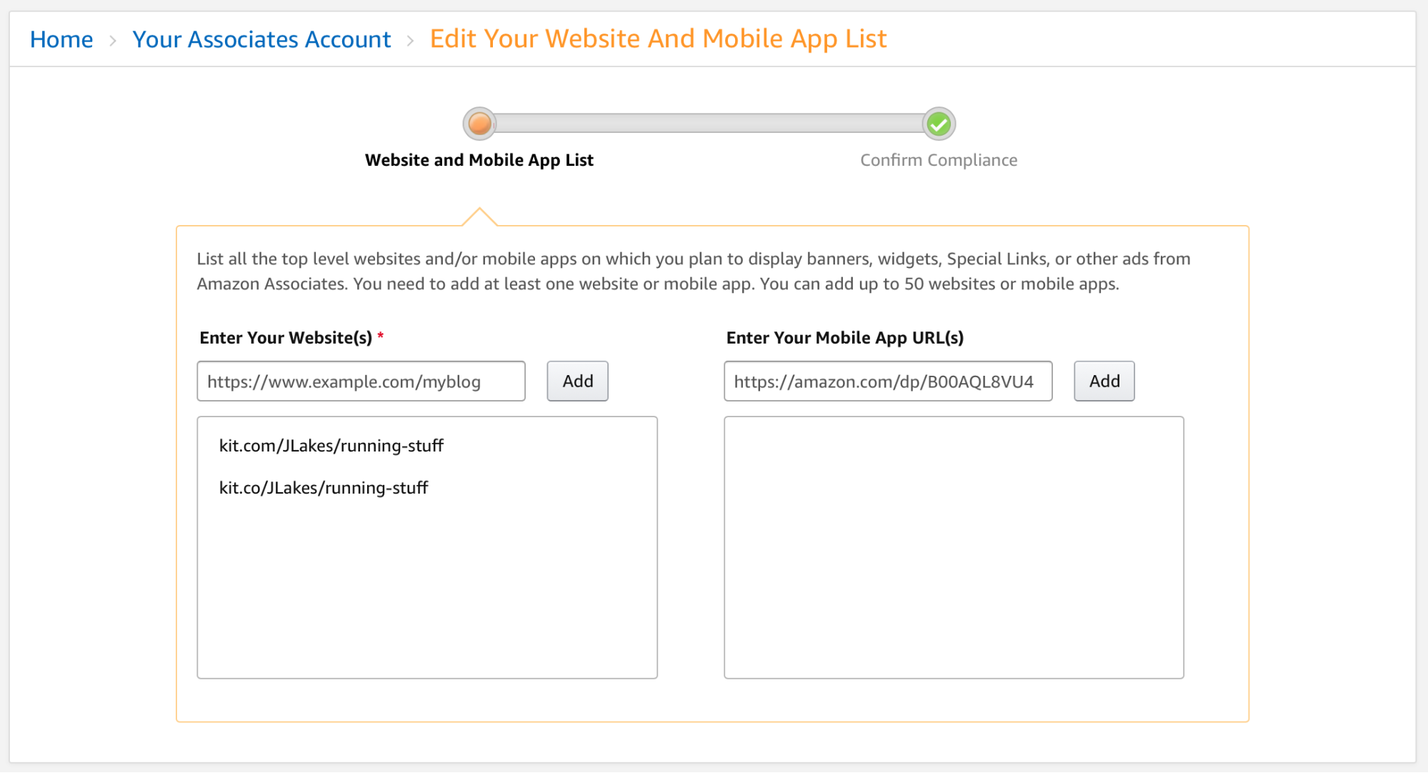 Not listing your site/channel - Remember that step when you were signing up for the Amazon affiliate program where you listed the various sites and social media channels you were planning on using your links? Well, have you kept that updated? Unfortunately, it’s easy to have a shifting strategy and place your affiliate links in new places and forget to update that list (via the Associates Central dashboard). This can get you in trouble with the Amazon compliance team and is easy to do.
